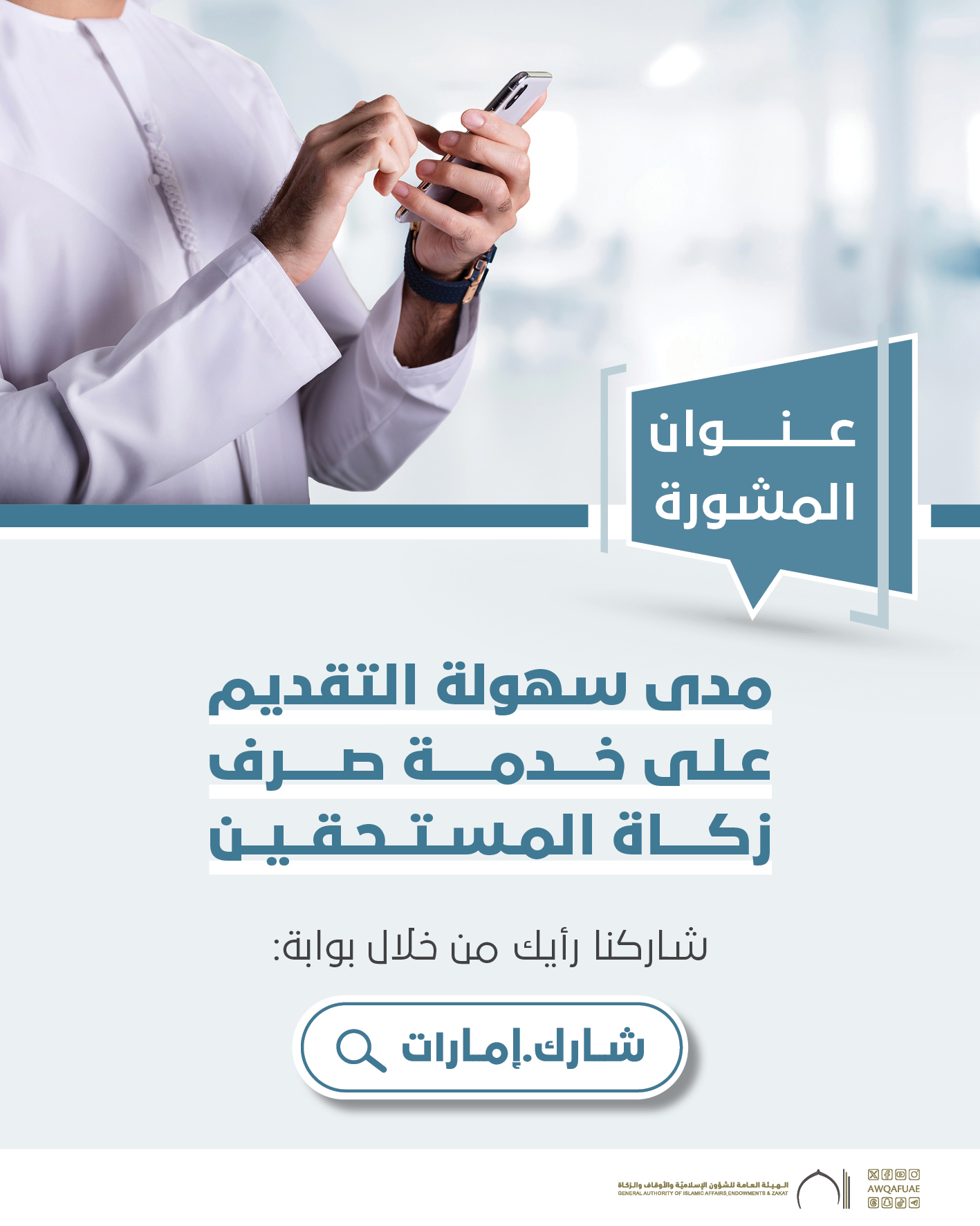في إطار حرص الهيئة العامة للشؤون الإسلامية والأوقاف والزكاة على تعزيز جودة الخدمات الاجتماعية وتطوير منظومة المساعدات المالية، واستمراراً لنهجها في إشراك المتعاملين في تحسين الخدمات، تطلق الهيئة هذه المشورة الرقمية بهدف قياس مدى سهولة التقديم على التقديم على خدمة صرف زكاة المستحقين، والوقوف على تجربة المستفيدين أثناء مراحل التقديم المختلفة، بما يسهم في الارتقاء بمستوى الخدمة وتحسين كفاءتها وتبسيط إجراءاتها.