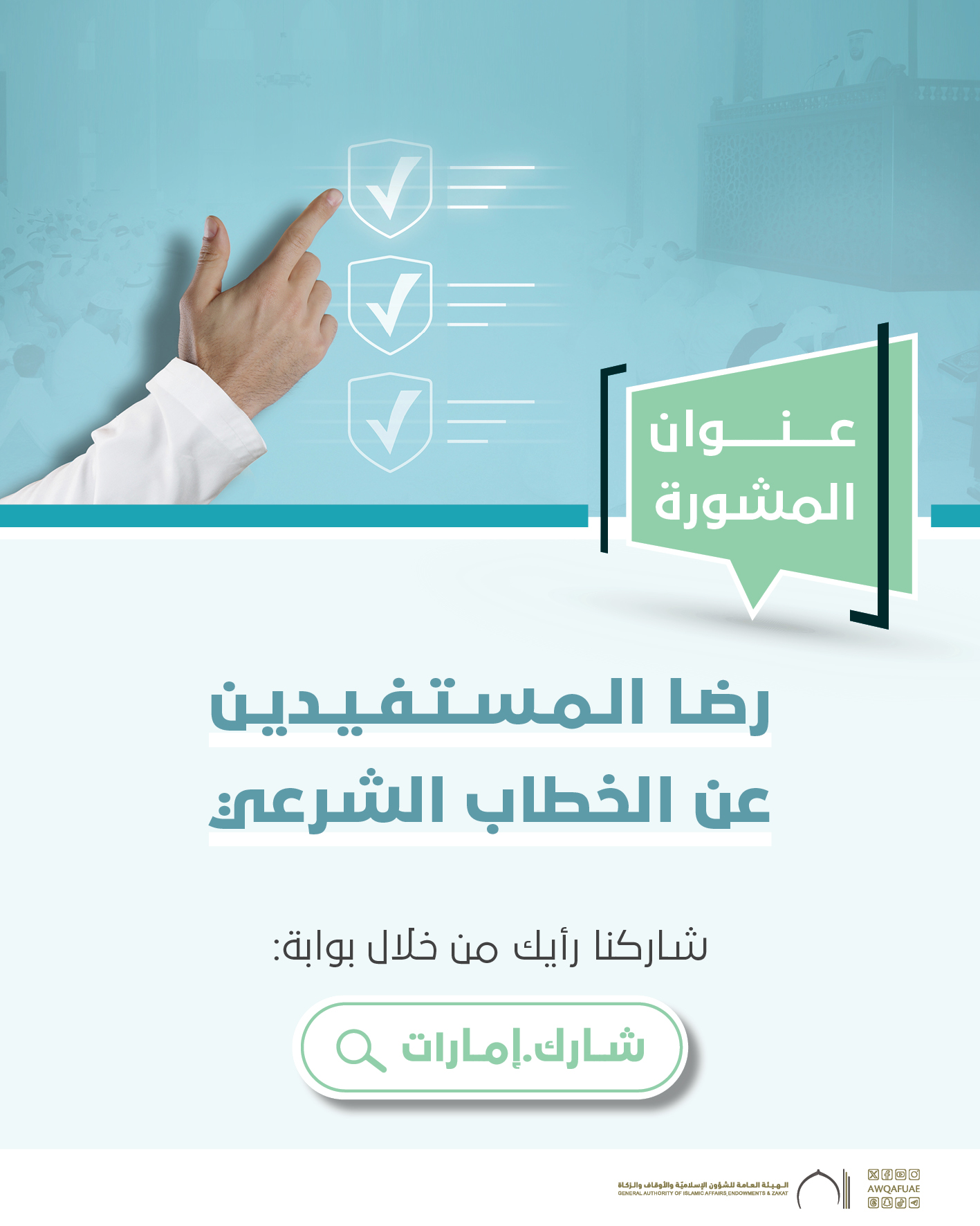 انطلاقاً من دور الهيئة العامة للشؤون الإسلامية والأوقاف والزكاة في نشر الخطاب الشرعي المعتدل، وتعزيز القيم الإسلامية والمجتمعية، تحرص الهيئة على قياس مستوى رضا المستفيدين عن الخطاب المقدم عبر مختلف القنوات، بما يضمن مواءمته مع احتياجات المجتمع وتطلعاته، ويسهم في تطوير المحتوى وتعزيز أثره الإيجابي.