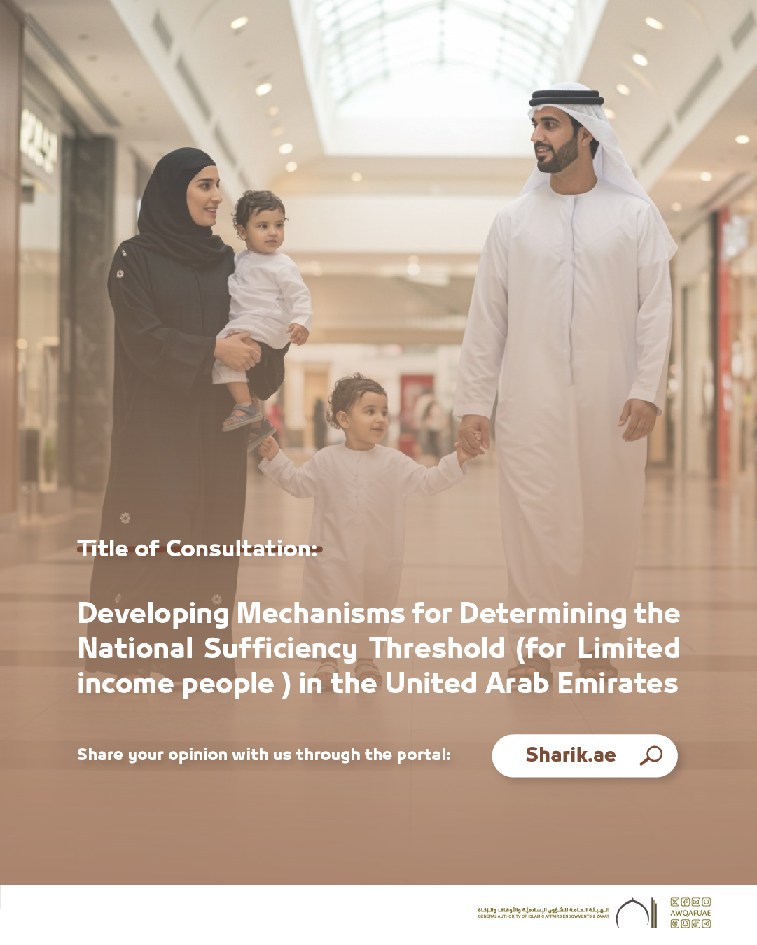 As part of the UAE Government's commitment to enhancing quality of life and improving living standards for all members of society, the relevant authorities are working to develop accurate measurement tools that ensure the fair and transparent allocation of social support and assistance. In line with this approach, this public consultation aims to gather public opinions and suggestions on developing mechanisms for determining the National Adequacy Threshold, one of the key indicators used in designing social support policies and assessing eligibility for zakat and social aid. Your participation represents an essential contribution to supporting the efforts of the General Authority of Islamic Affairs, Endowments, and Zakat in building a more precise and equitable support system that meets the requirements of a dignified life across all Emirates of the nation.